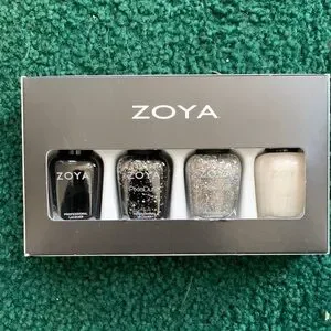 Elevate your style with Zoya's nail lacquer collection. Includes bold black, sparkling silver glitter, and elegant cream shades. Perfect for any look.
