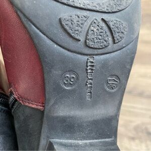 These Remonte Dorndorf boots are in good used condition. Black, red, and gray leather design. Ties in a bow at the back. Some mild scuffing at the toe. Size 39.