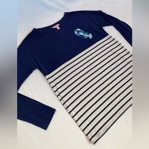 This boat neck pull over is made from coastal jersey (47% modal, 47% Pima cotton, 6% spandex). Relax, fitted, boat neck line, tea with long sleeves, drop shoulders, and yolk steam details.