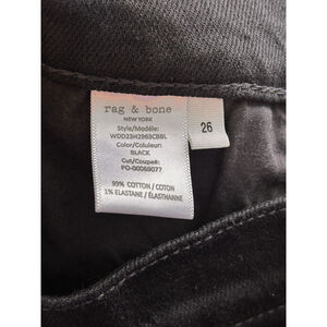 The NWT Rag & Bone Wren High Rise Full Length Slim Jeans in Women's size 26 in Black Stretch are a stylish and versatile option for any wardrobe. Made from a cotton blend denim with a high rise and slim fit, these jeans feature a button and zipper closure, a 5-pocket design, and a straight leg style. The black color and solid pattern make them perfect for any season, while the stretch fabric ensures a comfortable and flattering fit. With the renowned quality of the rag & bone brand and the timeless appeal of the Wren model, these jeans are a chic choice for both casual and dressy occasions.