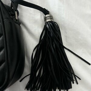Chic black crossbody with chevron pattern. Features iconic YSL logo. Perfect for versatile styling.