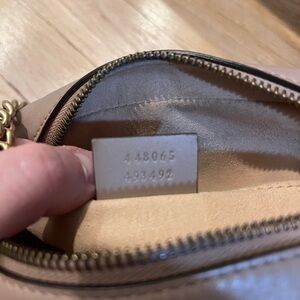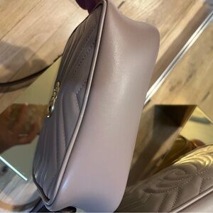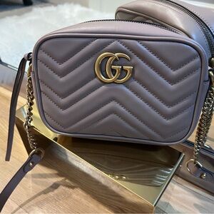 SOLD Chic Gucci crossbody in lavender. Features iconic GG logo and gold chain strap. Perfect for stylish outings. Very small ink spot inside, otherwise great condition. Can provide box