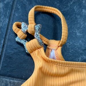 NWT- Stylish kids swim bikini by Old Navy. Cute one should double strap with glitter star. Features a vibrant orange color. Ribbed fabric that Comfortable and trendy design.fully lined with UPF 40.