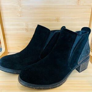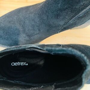 Chic black ankle booties by Aetrex. Sleek design with a comfortable heel. Ideal for versatile styling.