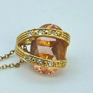 Keywords: necklace, simulated stone, citrine, crystal, rhinestones, gold tone, RMN, stamped, the Roman company, 9 inch necklace, pendant, orange, white, gold, costume jewelry, sparkle, bling, fashion jewelry, oval pendant, princess, queen, coquette girl, work, office, party, bridesmaid gift, wedding, guest gift, bridal, birthday, gift, sparkle, bling, well-made, quality, women’s, accessories, jewelry, preppy, Barbie core, minimalist, maximalist, neutral, summer, festival, formal, dressy