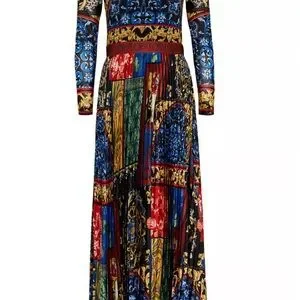 Chic midi dress with intricate blue and red patterns. Long sleeves and elegant design. Ideal for standout occasions.