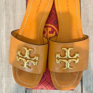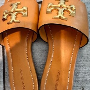 EUC Elegant Eleanor slide sandals size 7 in bourbon with gold logo accent. Perfect for casual wear.