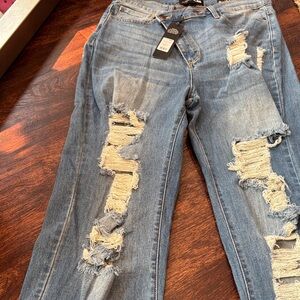 Trendy ripped skinny jeans. Perfect for casual outings. Comfortable fit. Have a slight triangle button going across the front see pictures. 2 back pockets. Great for someone with longer legs