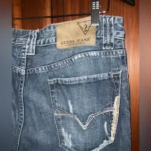 Casual Guess comfortable relaxed fit jeans. Distressed detailing for a trendy look. Ideal for everyday wear. Front and back pockets. Size 32X32. Pre-loved like new, no flaws…D