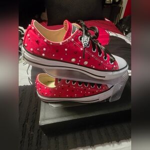 Bold red Converse sneakers with black laces. Iconic style with a modern twist. Shoes are decorated with black and pearl beads, which makes them have a lady bug look.
