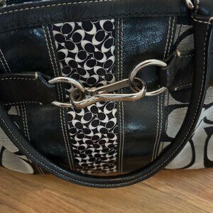 Beautiful Coach handbag. Comes from smoke free home. Shoulder bag or can be used as a tote in great condition. Gently used only a handful of times. Has feet at the bottom of the bag. Zipper closure. Beautiful blue fabric interior. No stains. Size: 14 inches length 9 inches height 5 inch opening.