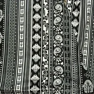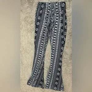 Stylish black and white patterned pants. Perfect for casual wear. Inseam measures 29” in length and the width of the flares are 14” but the material allows it to flow as you walk. Size S. Pull on. elastic waist. EUC, smoke free home