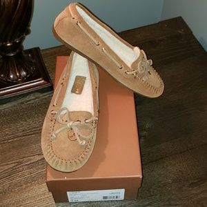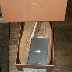 Moccasin style slipper with curly shearling interior lining & suede leather upper. Features leather threaded around top & tied in a bow at the toe accented with a circular enameled Coach tag. Rubber non slip grip bottom. New never used. No stains or damage. Includes the care card that came with the shoes.. No profit to be gained. I'm charging what I have to, considering the fees, in order to get what I paid for them.