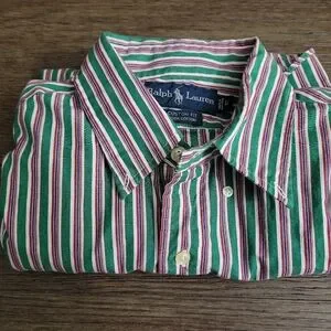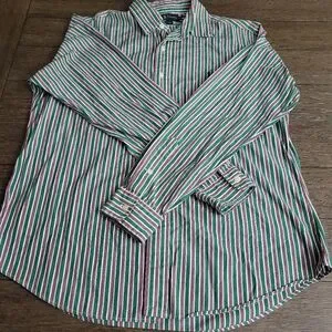 Ralph Lauren Men's Custom Fit Multi-color (Green, red, blue, and white stripes) Long Sleeve Buttonup Dress Shirt (Size Large LG) up for sale. Item is pre-owned and in good condition.