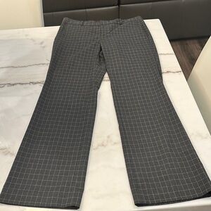 Chic gray checkered pants. Straight leg design. Ideal for versatile styling. Waistband is a hook button and zip closure. The trouser has belt loops as well. Two button pockets in the back currently unopened.