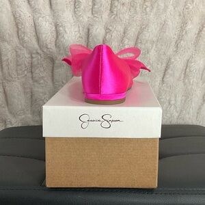 Bright pink flats with a large bow accent. Perfect for a bold fashion statement.