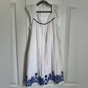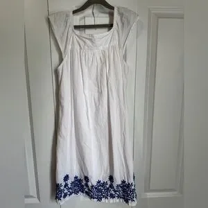 Gorgeous 100% cotton white dress with blue embroidered border and neckline trim. Lightweight and comfortable. Perfect summer dress.