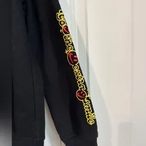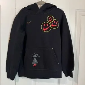 Cozy black hoodie with playful smiley face graphics. Features front pocket and Nike logo.