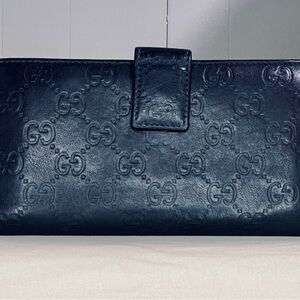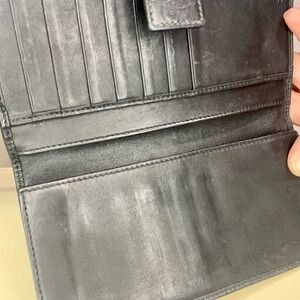 Authentic GUCCI plate canvas leather wallet. Black monogram design. 7 card slots, 4 long compartments, large coin snap pocket. Gold hardware. Great used condition.