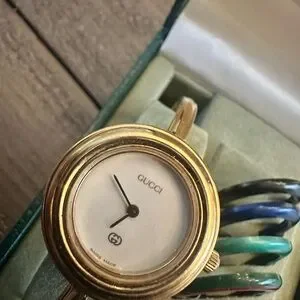 Stylish Vintage Gucci watch in gold with vibrant interchangeable bezels. Ideal for versatile fashion.