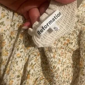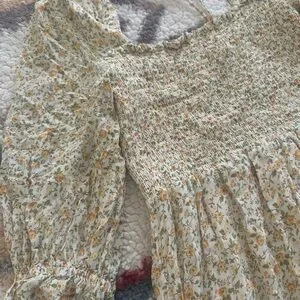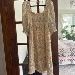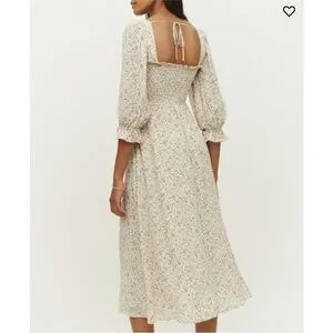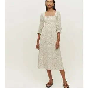 Fresh florals. The Fable is a midi dress with a fitted, fully smocked bodice. It features a loose fitting skirt and 3/4 length, puff sleeves for a slightly dramatic look.