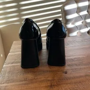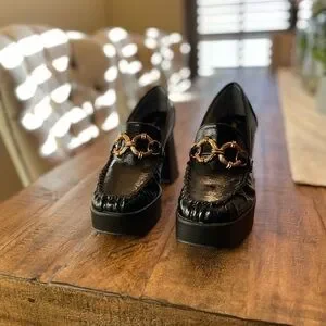 Step out in style with these elegant black loafers, featuring a striking gold chain detail. Perfect for any occasion.