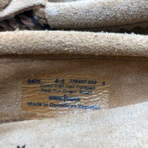 New without box Minnetonka Moccasins in taupe light brown suede with cheetah print dyed calf hair toe. Padded insole, rubber grip sole. Style 347F. Size 6.5.
