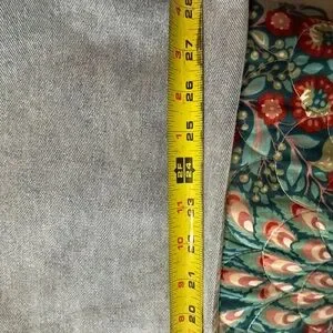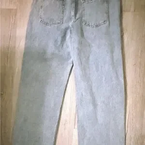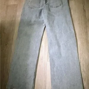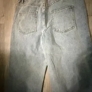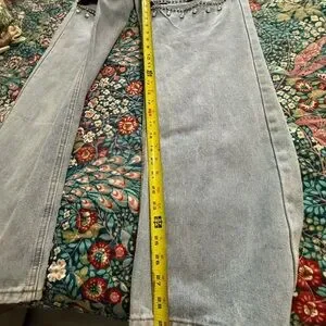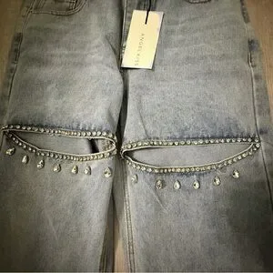 Stylish light blue jeans with elegant embellishments. Perfect for a chic and trendy look.