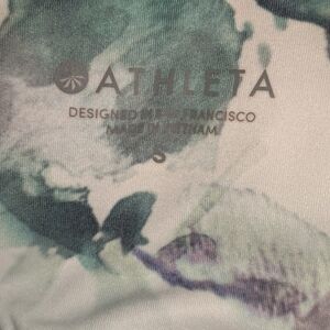 Stylish leggings with a watercolor design. Features shades of green, purple, and gray.