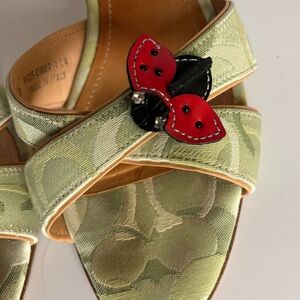 Elegant Coach sandals with a green base and striking red ladybug details. Ciara II size 9B made in Italy. Perfect for adding a touch of style.