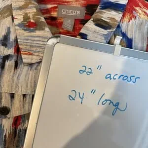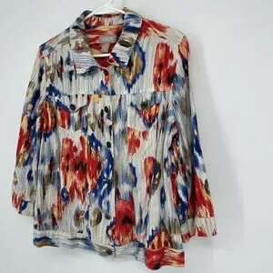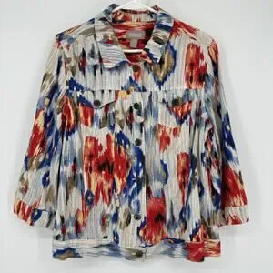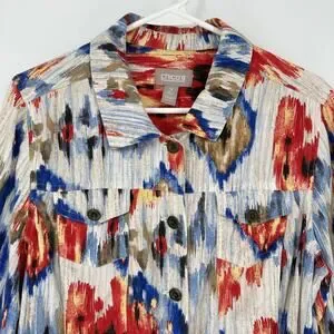 Chicos Jacket LARGE Multicolor Ikat Print Button Front Linen Blend Boho 22x24
