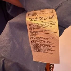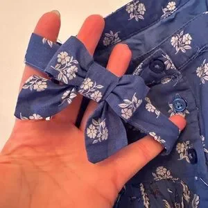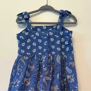 This 100% cotton dress features floral designs in contrasting cobalt and chocolate hues, a button-up back, full skirt lining and beautiful little bows atop the shoulders. In excellent condition, no flaws.