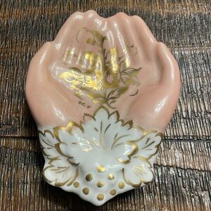Elegant pink trinket dish with gold floral design. Perfect for small items. Vintage Amoges Porcelain Hand Painted Trinket Dish Hands Together Rare Find. Hand painted gold rose in center palms. Great to lay earrings, rings, bracelets, chains or even as a soap dish.