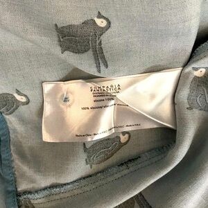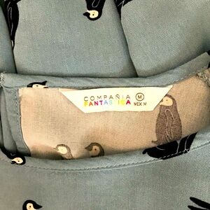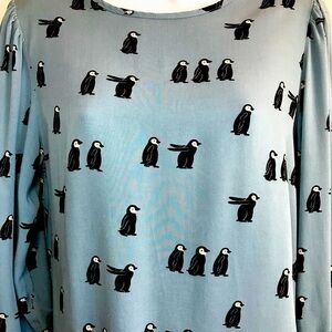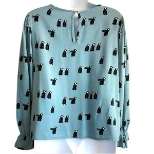Women’s Mexico Compañia Fantastica Brand 100% Viscose blue & black all-over penguin 🐧 print long ruffle edge sleeve back keyhole top blouse size medium in excellent pre-owned condition.
