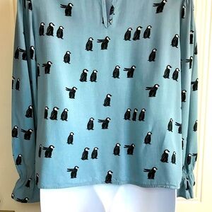 🔴 4/$15 Penguin print blue long ruffle edge sleeve viscose blouse size M in EUC