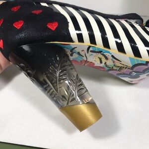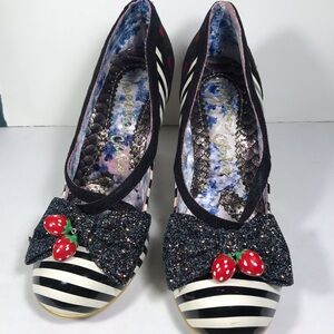 Irregular Choice Black and White Striped Heels with Red Heart Strawberry Accent