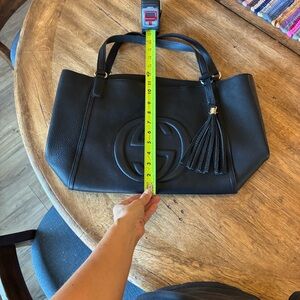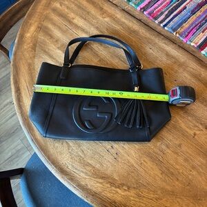 Black leather tote. *not* GU**I!* used but in good condition, see photos. Great bag- spacious!