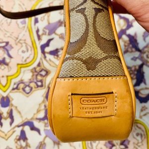 Stylish Coach bag with signature pattern. Brown leather accents. Tan canvas body. Perfect for everyday use.