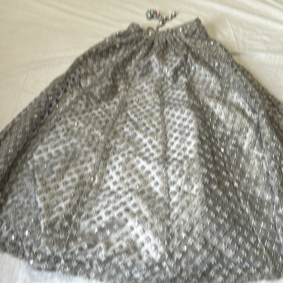 Stunning dress with intricate embellishments. Peach top with silver detailing. Flowing silver skirt with elegant patterns.