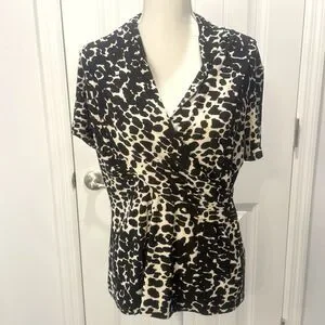 DKNY Shirt Women’s L Black Leopard Short Sleeve Wrap Top Blouse Ladies NWT