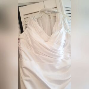 Chic white gown with a striking turquoise sash. Ideal for a modern bride.
