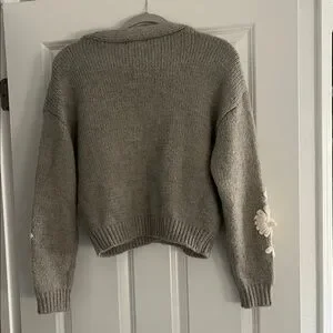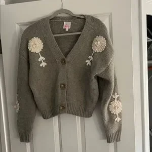 Chic gray cardigan featuring delicate cream floral patterns. Perfect for layering.