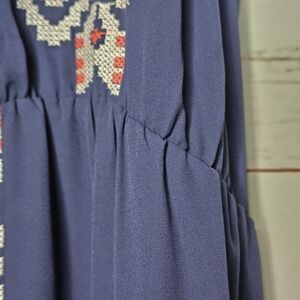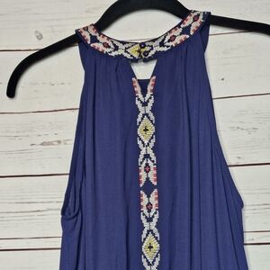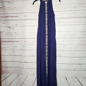 THML Maxi Dress. Navy Blue with Choker/Halter Neck. Embroidered Detail at Neckline, Bodice and Front and Back Center. Cut Out Front and Keyhole Back. Back Button Neck Closure. Elastic Waist. Half Lined. Sleeveless. Great Preowned Condition. Size Medium. Flat Lay Measurements: Chest 16" Waist 14" Hips 20" Length 56"