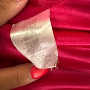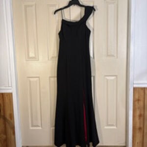 This is a pre-owned Betsy & Adam black gown, size 4. The dress features a unique one-shoulder design with a single spaghetti strap. It has a floor-length silhouette with a slit on one side, revealing a bright pink lining. The outer material is 94% polyester and 6% spandex, while the lining is 100% polyester. The dress appears to be in good condition with no visible imperfections.