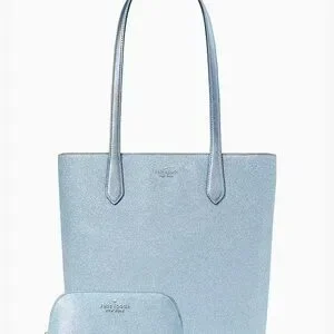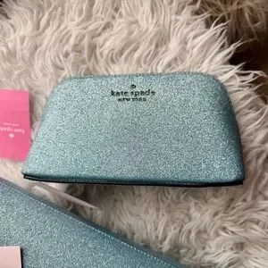 Zipper Carrying Bag 13'' W x 12.5'' H x 1.75'' Smooth Glitter Inner Lining and 1 Interior Zipper Pocket. Bonus makeup bag. NWT. Color is Frosty Sky (light glitter blue)