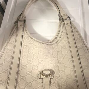 Early 2000 Gucissima collection, white leather bag with gold hardware. Inside is an excellent condition there is sort of a tear in the leather on the front as a picture. It’s very minimal otherwise the leather is an excellent condition no crack or peeling.