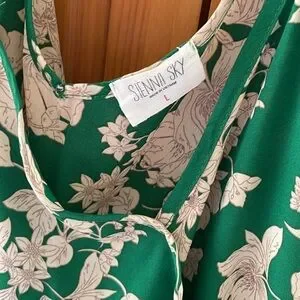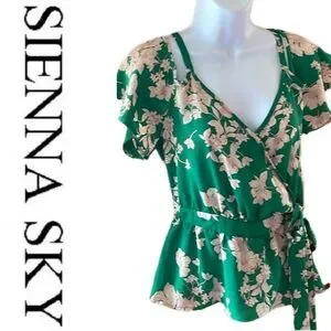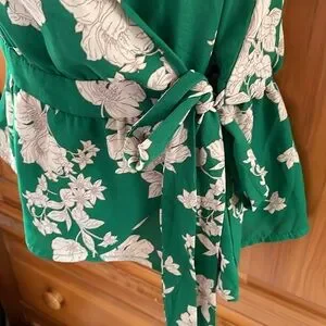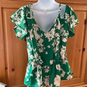 Brand new without tags! No stains, tears, rips, holes, pilling, discoloration, or shrinkage. Never worn before. A slightly relaxed fit. 100% Polyester. A silk- like texture. Elegant green women's top with a beautiful floral pattern. Perfect for any occasion. It is a short sleeve, cold shoulder (off the shoulder), v neck crop top. A bright green with a cream colored floral print. It has a ribbon belt that ties in the front. The front, back, straps, sleeves, and ribbon match the print on the shirt. It is great for the summer, spring & fall! It is great for outings, parties, vacation, dates, social outings and more! It pairs nicely with dress pants, khakis, skirts, or leggings, jeans, jean shorts for a more casual look. Pairs nicely with sandals, flats, or boots. It pairs nicely with a cardigan in cooler weather. Bundles of any 2 or more items are 30% off in my closet. Comment with any questions. I am open to offers.