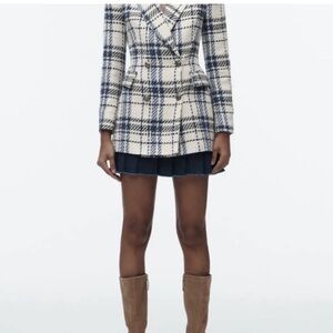 ZARA BLOGGER FAVE Blue & Cream Plaid Check Double Breasted Blazer Jacket NWT