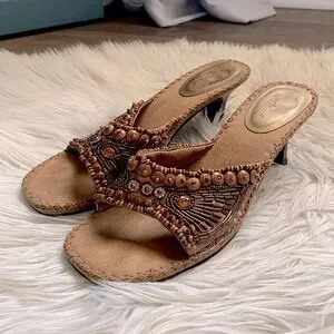 Step out in style with these elegant beaded tan sandals. Perfect for any occasion, these shoes offer both comfort and fashion.
