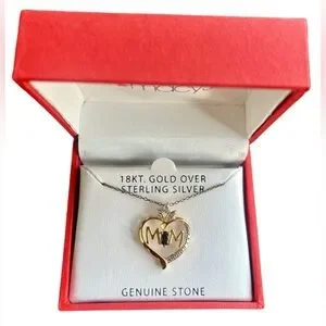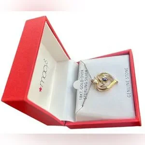 Elegant Macy's Mom's necklace featuring a gold and silver heart design with sapphire stone. Perfect for adding a touch of sophistication to any outfit. Great gift for Mom. Same day shipping M-F. Smoke free home. 8/6